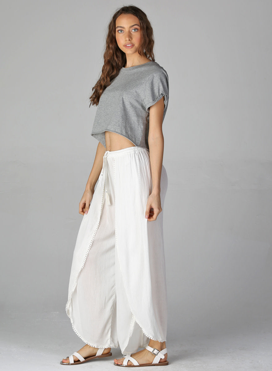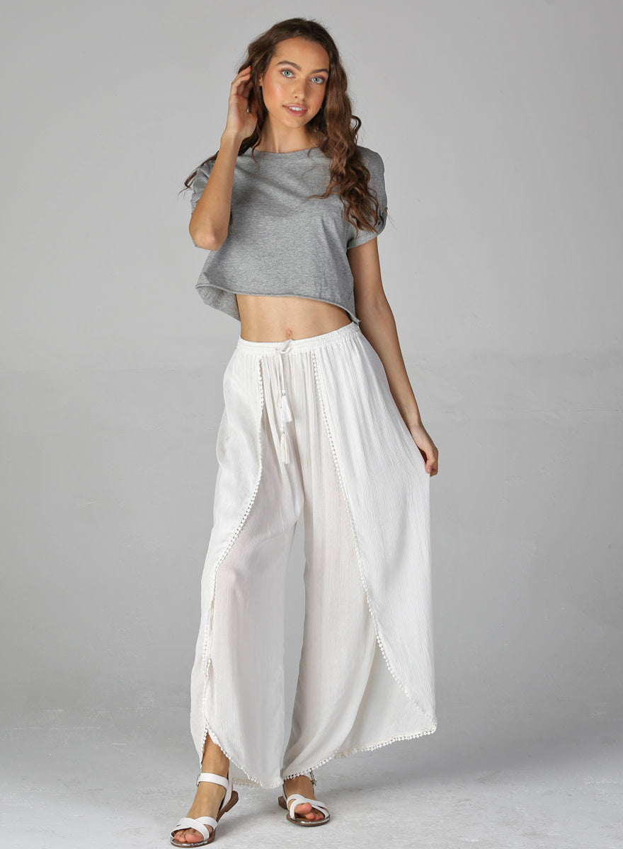 Fly Away High-Waisted, Wide-Leg Pant with Pom Pom Tie/ White