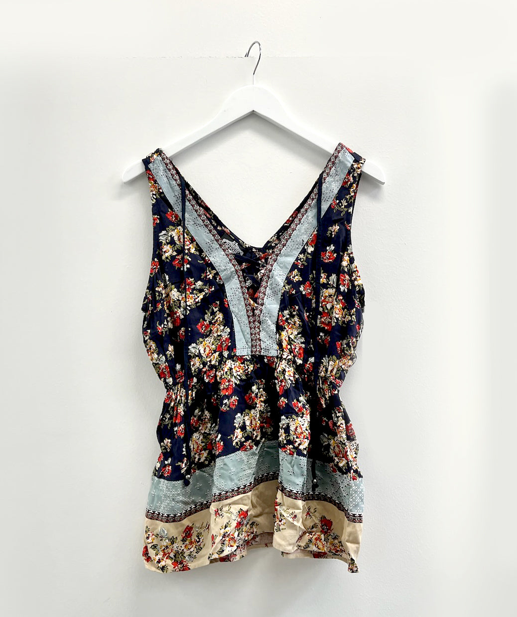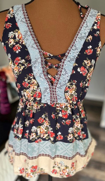 Sleeveless Summer Top with Cross Front Detail/ Navy Floral