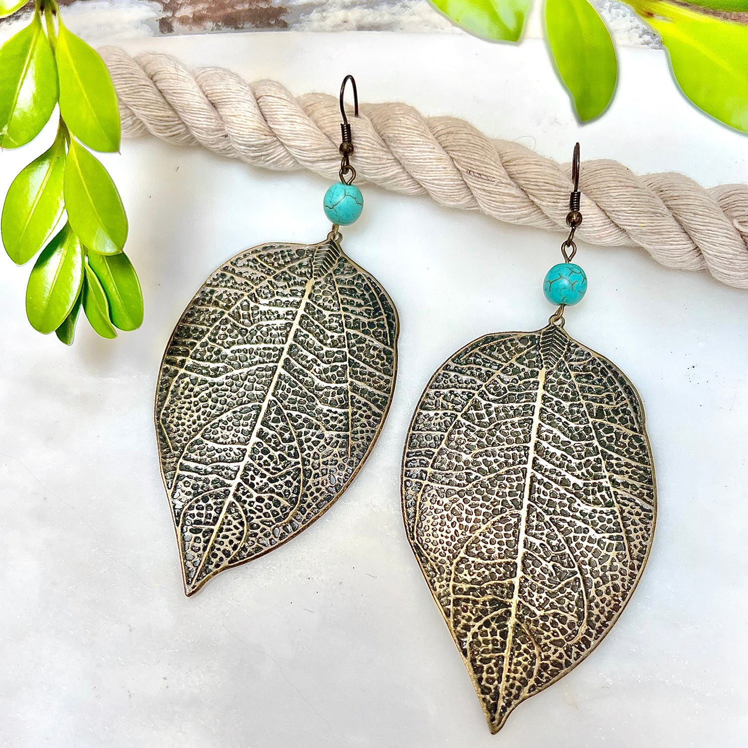Large bronzed leaf detail, teal bad detail, mixed metal, hook