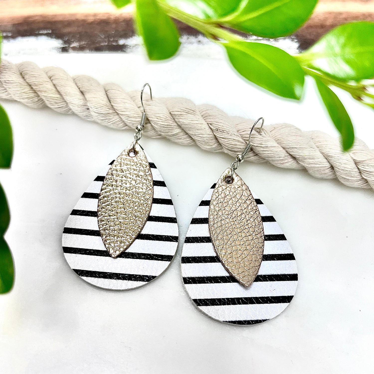 Faux Leather White and Black Cut Out, Pewter Leaf, hook, lightweight