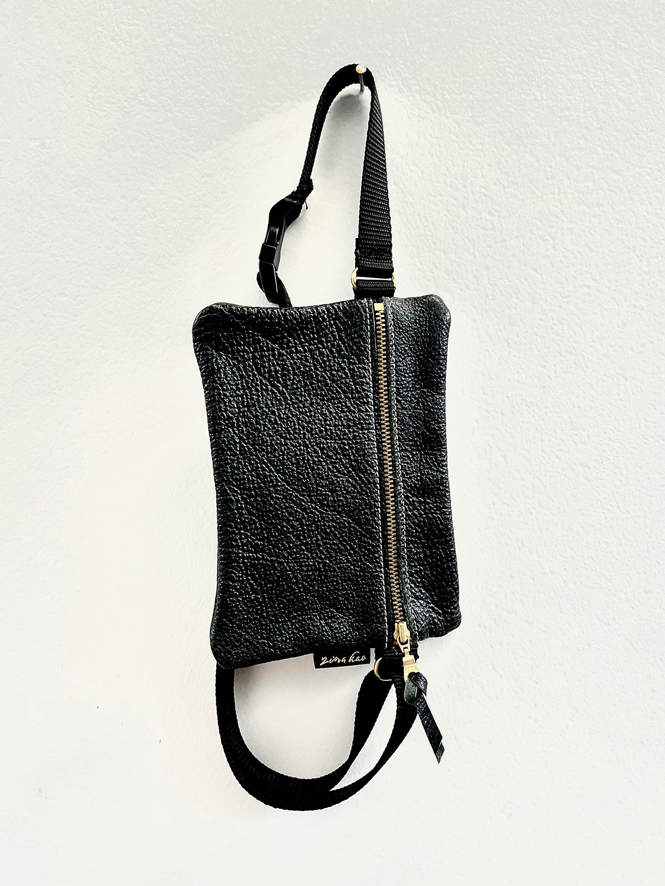 Local artisan Zina Kao, small metallic Black, handmade cross body pouch. premium Italian leather, quality bronze zipper, adjustable strap