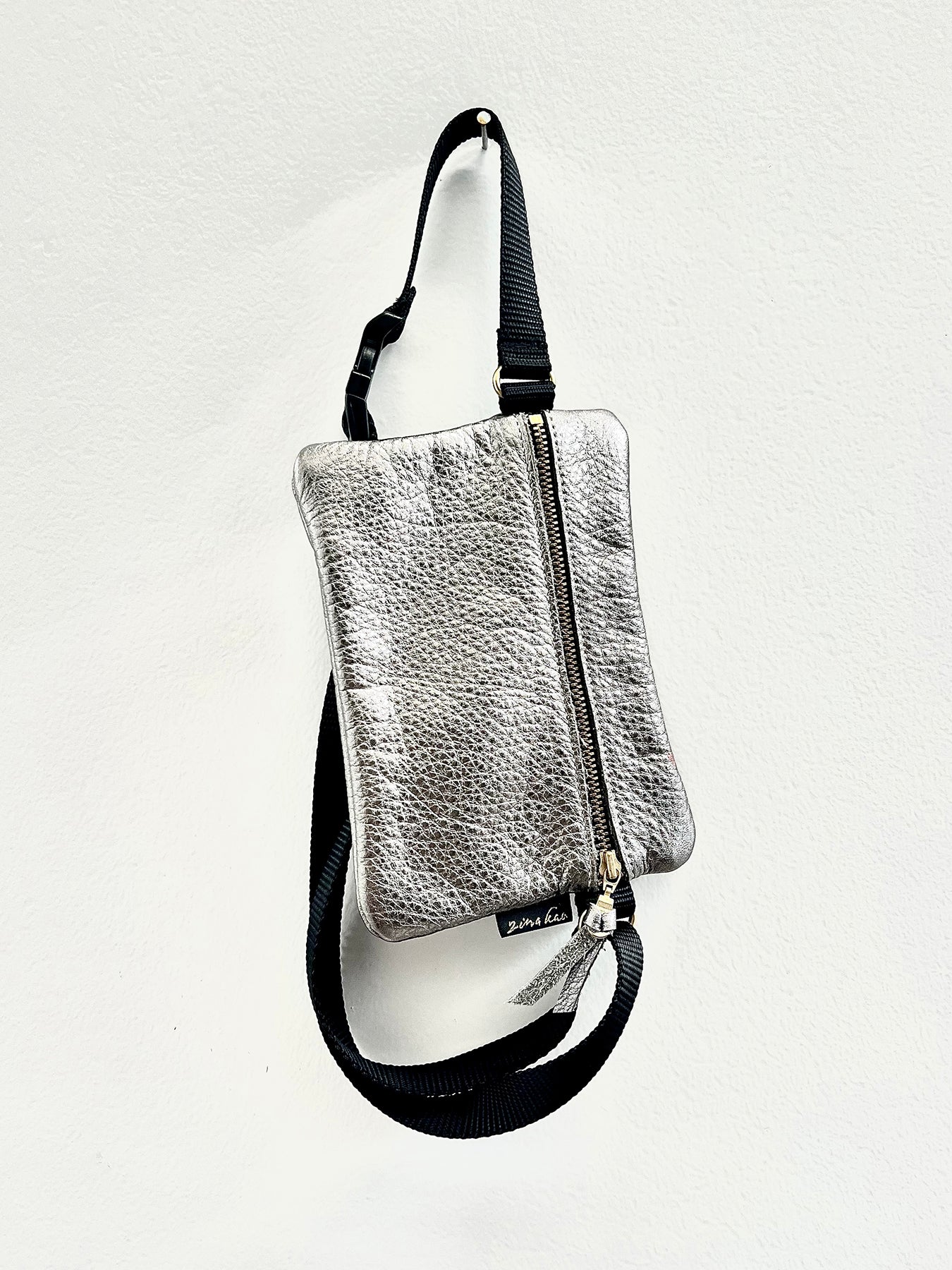 Local artisan Zina Kao, small metallic Pewter, handmade cross-body pouch, premium Italian leather, quality copper zipper, adjustable strap