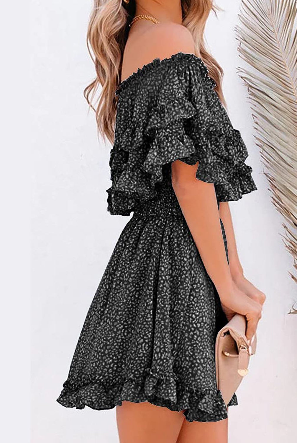 Flowy Off Shoulder Speckled Ruffle Mini Dress/ Black & White